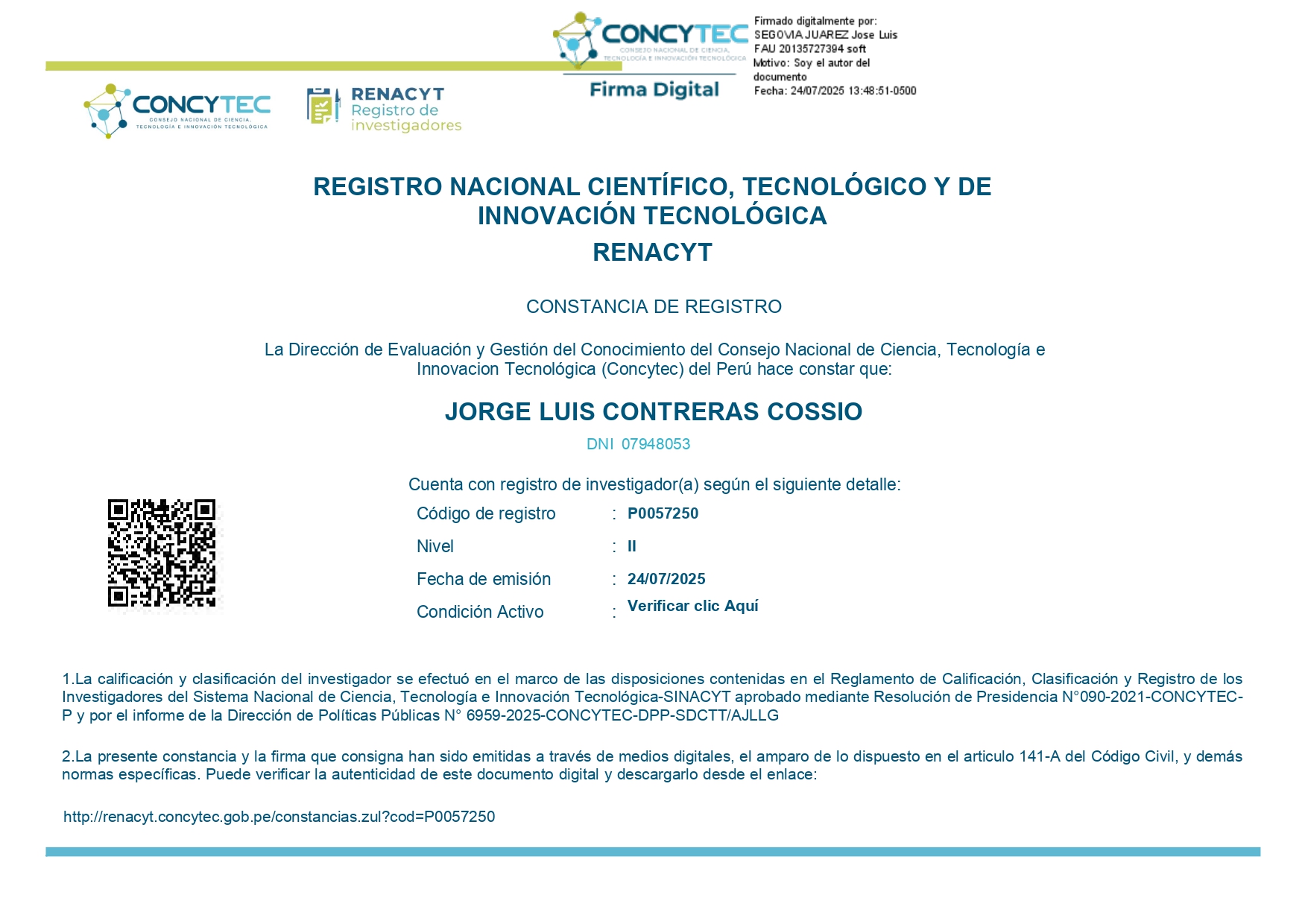 Registro de investigador nacional RENACYT